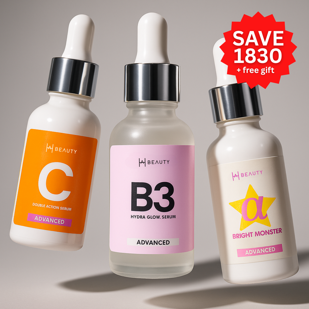 The Brightening Trio A glow-getting bundle of 3 serums - Vitamin C, Niacinamide, and Alpha Arbutin, to fade dark spots, hydrate deeply, and even out skin tone. Gentle, beginner-friendly, and perfect for daily layering.